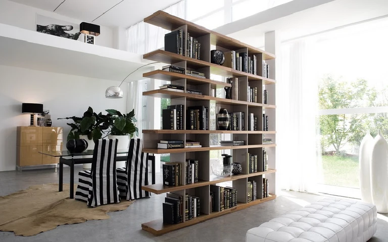 Bookshelf dividers are a practical and stylish partition design for living room. They combine storage and separation seamlessly, allowing you to display books, decor, and personal items. Modular shelving units offer customization options to fit your specific needs and interior style. These dividers not only maximize space but also add a touch of sophistication to your living area, making them a versatile and functional choice for modern homes.