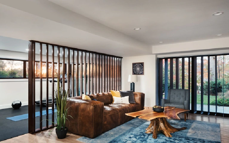 Slatted partitions are an excellent choice for a modern living room. Whether made of wood or metal, their minimalist design adds a contemporary touch while allowing light to filter through. Slats create a dynamic interplay of light and shadows, adding depth and character to the space. This design offers a balance between visual separation and an open feel, making slatted partitions a top choice for those looking to achieve a sleek and stylish living room layout.